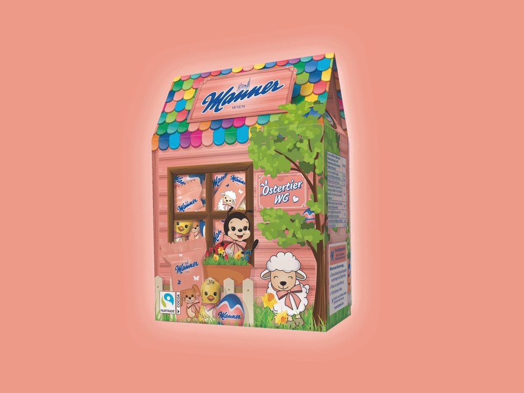 Dárkové balení zajíčka Manni je kombinací oplatek Manner a velikonočních vajíček a kuřátek z mléčné čokolády, které jsou plněny nugátovým krémem.