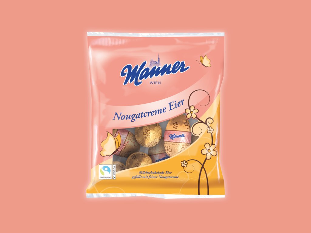 Manner velikonoční vajíčka vás budou svádět jemnou mléčnou čokoládou (s kakaem z vlastní pražírny) a potěší lahodnou nugátovou krémovou náplní.Tato kombinace vykouzlí oblíbenou chuť a potěší malé i velké! Sáček je naplněn 14 žlutými vajíčky, které jsou vhodné jak na rozdávání, tak do košíku.